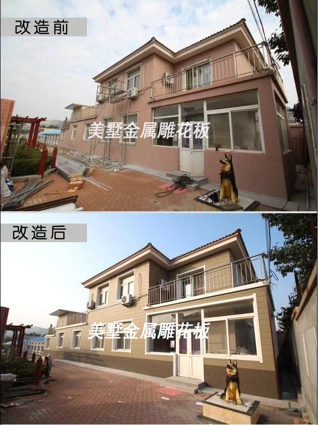 旧房容易出现的质量问题就是墙体剥离脱落导致透水、透寒,大大的降低了美观度和舒适度。大连佳合建材十余年行业经验,外墙选用美墅金属雕花板,很好的解决了透水透寒的问题,美化建筑外饰面,一举多得,性价比很高。